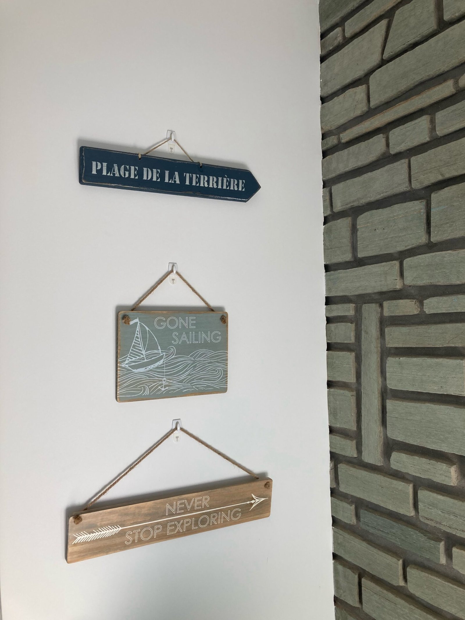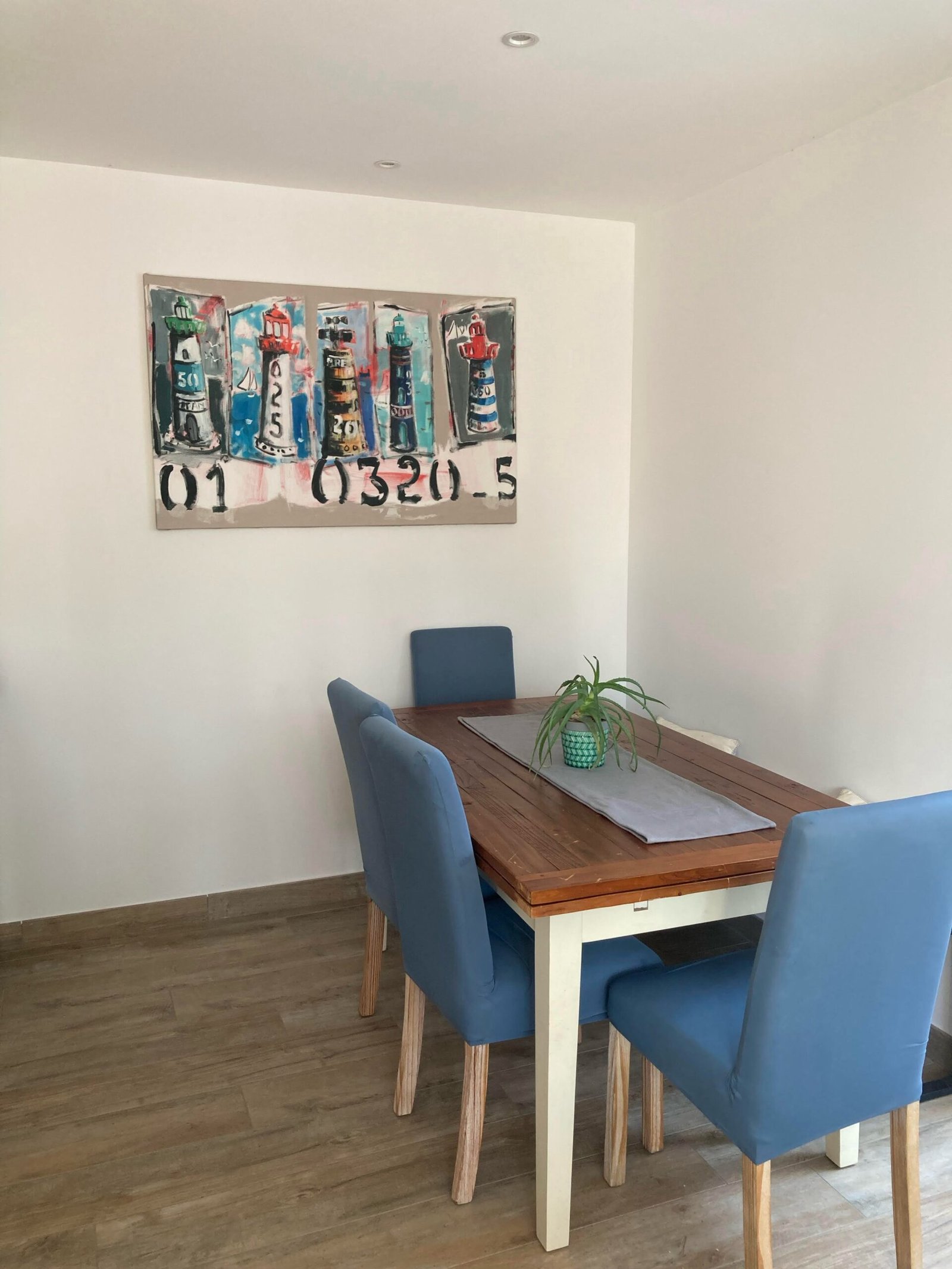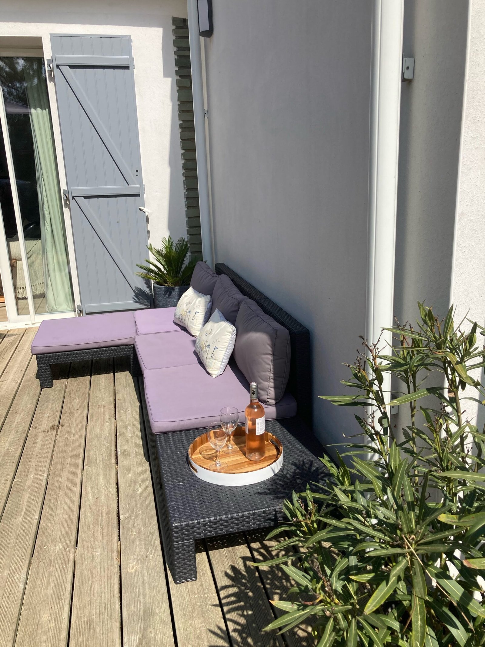 Three modern beach houses with large windows and balconies are situated side by side. A sandy beach lies in the foreground, and a tall palm tree stands behind one of the houses. Bright red umbrellas are visible on the patios, adding a pop of color to the neutral tones of the buildings.